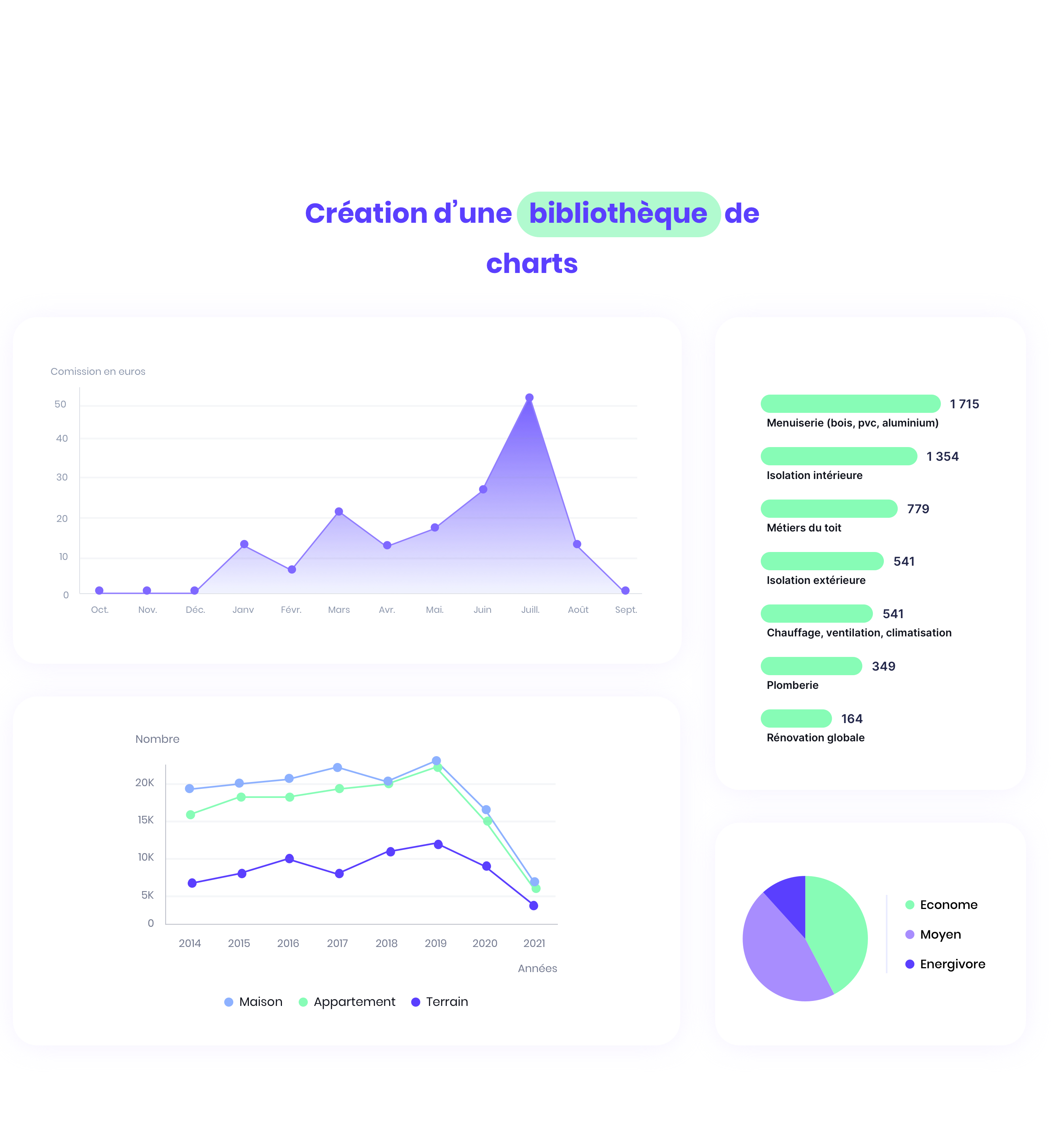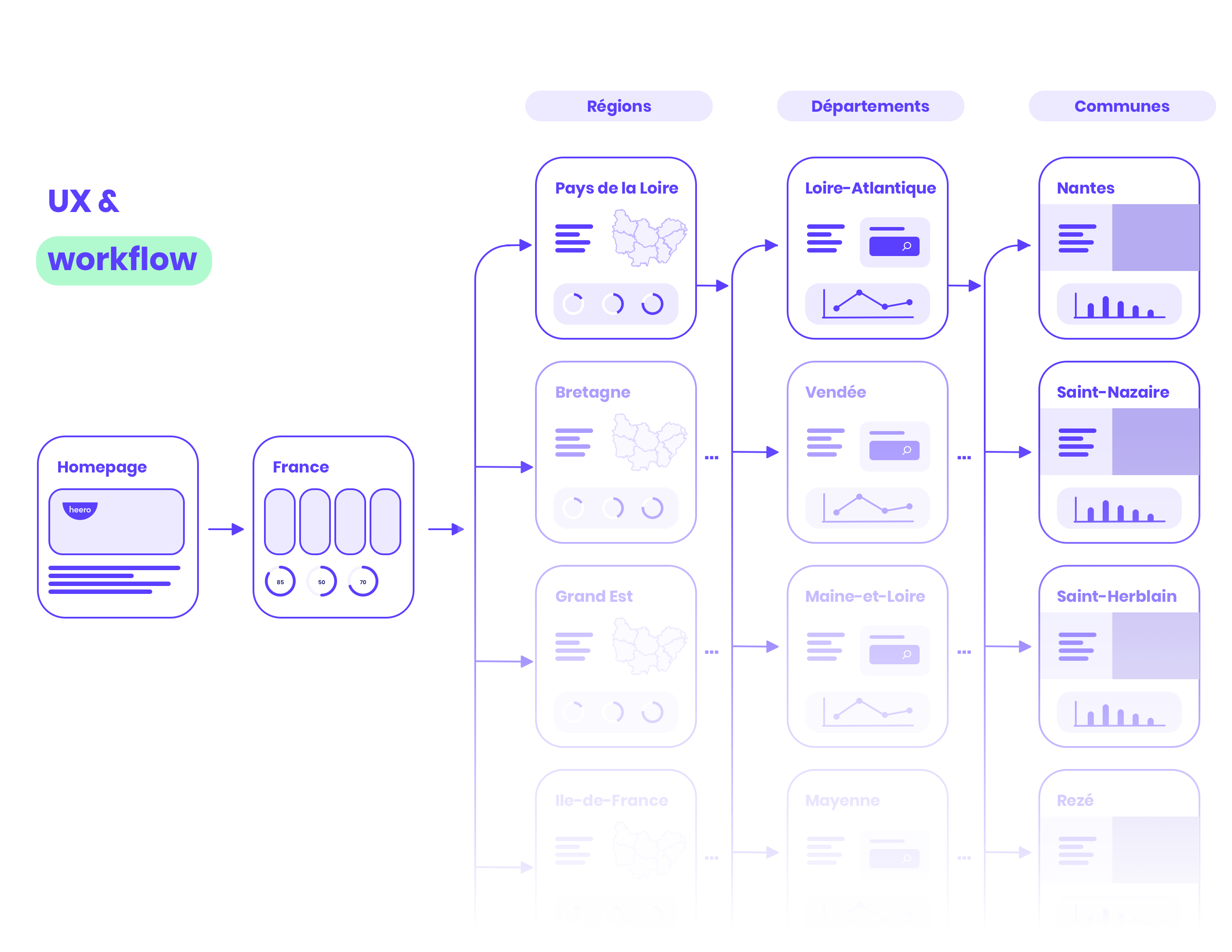 La marque Heero se positionne comme la référence en tant que rénovateur énergétique, toute une partie de son site est dédiée à informer ses utilisateurs sur la consommation et l’état de la consommation d’énergie en France. Chaque région, départements et villes sont présentés sous forme de dataviz suivant plusieurs critères : logements économes, sociétés RGE, type de rénovation, etc. Le challenge a été de faire du design s’adaptant dynamiquement pour chaque région, mais aussi de créer une librairie de charts afin de présenter toutes ces données en collaboration avec l’équipe de Data Scientist.