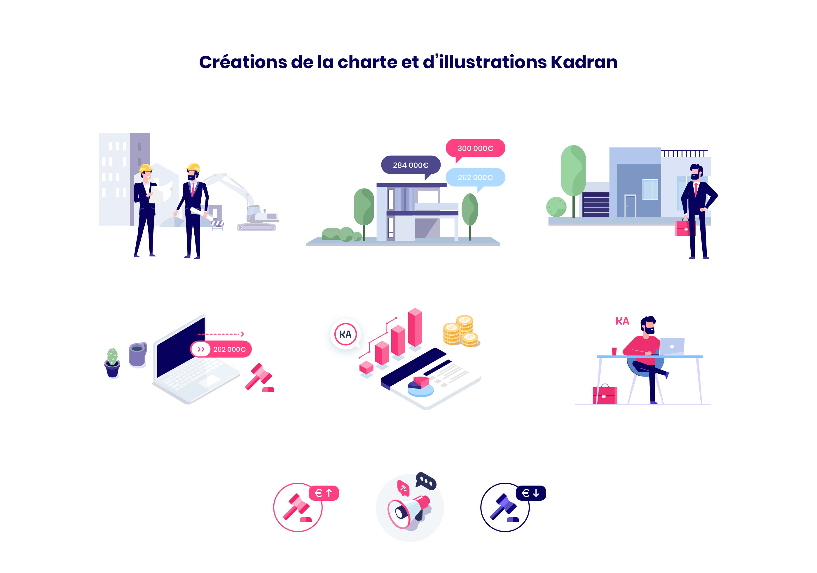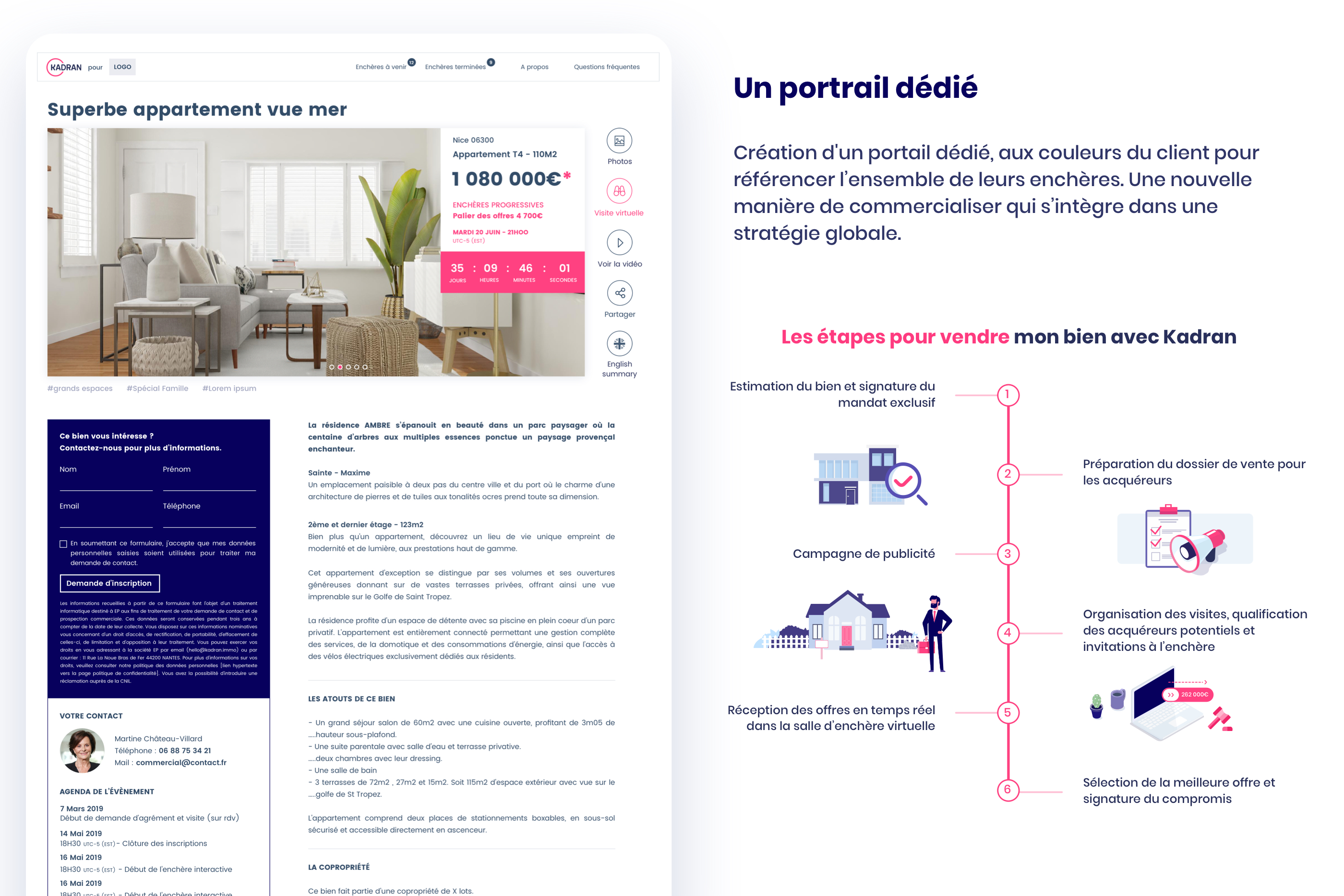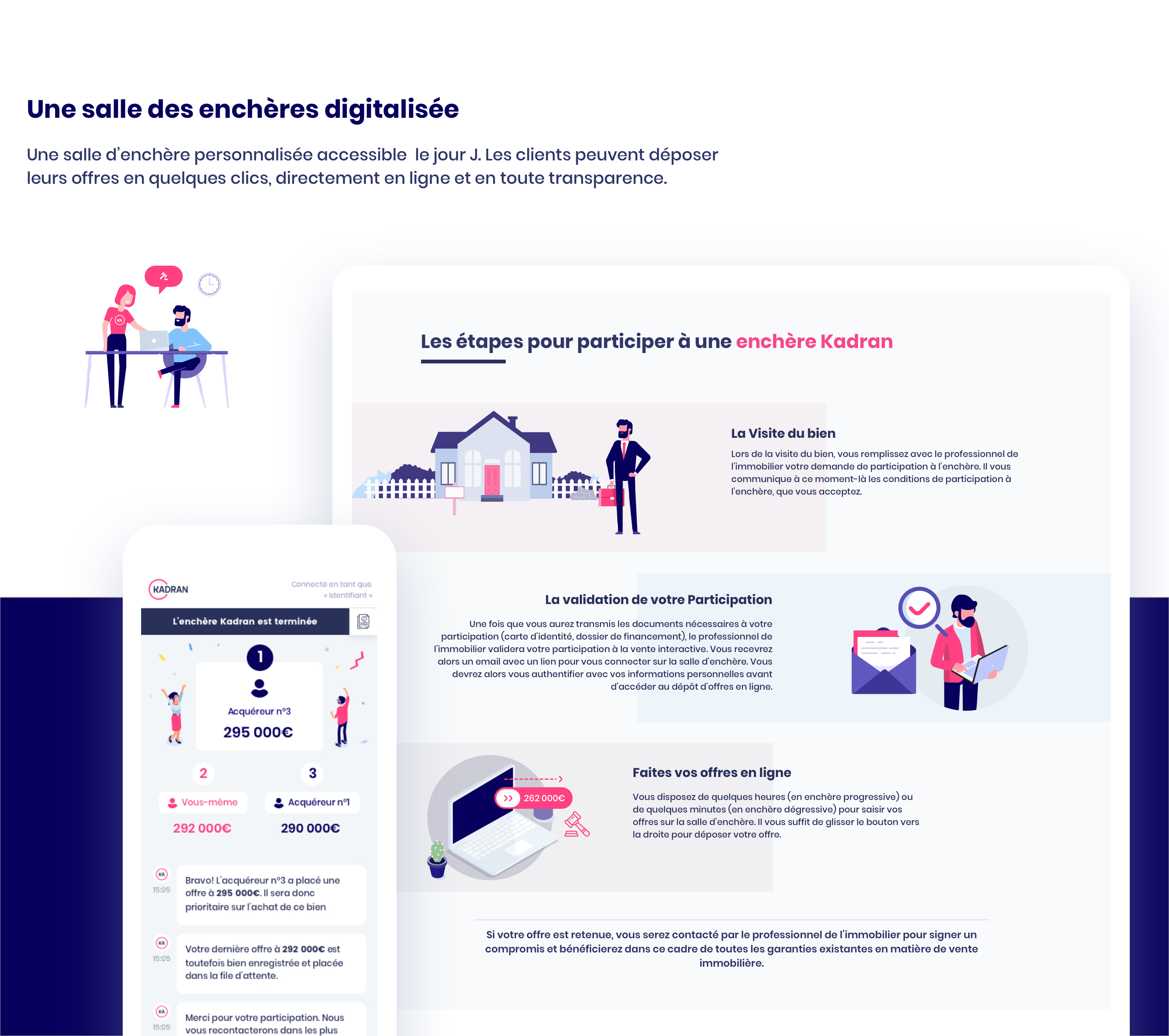Kadran est un site d'achat d'immobilier en ligne sous forme d'enchères interactives. Les acheteurs et vendeurs peuvent se connecter sur la plateforme pour créer leur annonce et avoir accès à la salle des enchères. Il y a deux types de ventes, les enchères progressives : un prix de départ volontairement bas est fixé et augmente au fil des offres faites par les potentiels acquéreurs et les enchères au cadran : le processus est inverse, on parle de vente dégressive, le prix de départ baisse en fonction de paliers sur un laps de temps spécifique. Le premier à cliquer fait une première offre sur le montant affiché à cet instant.