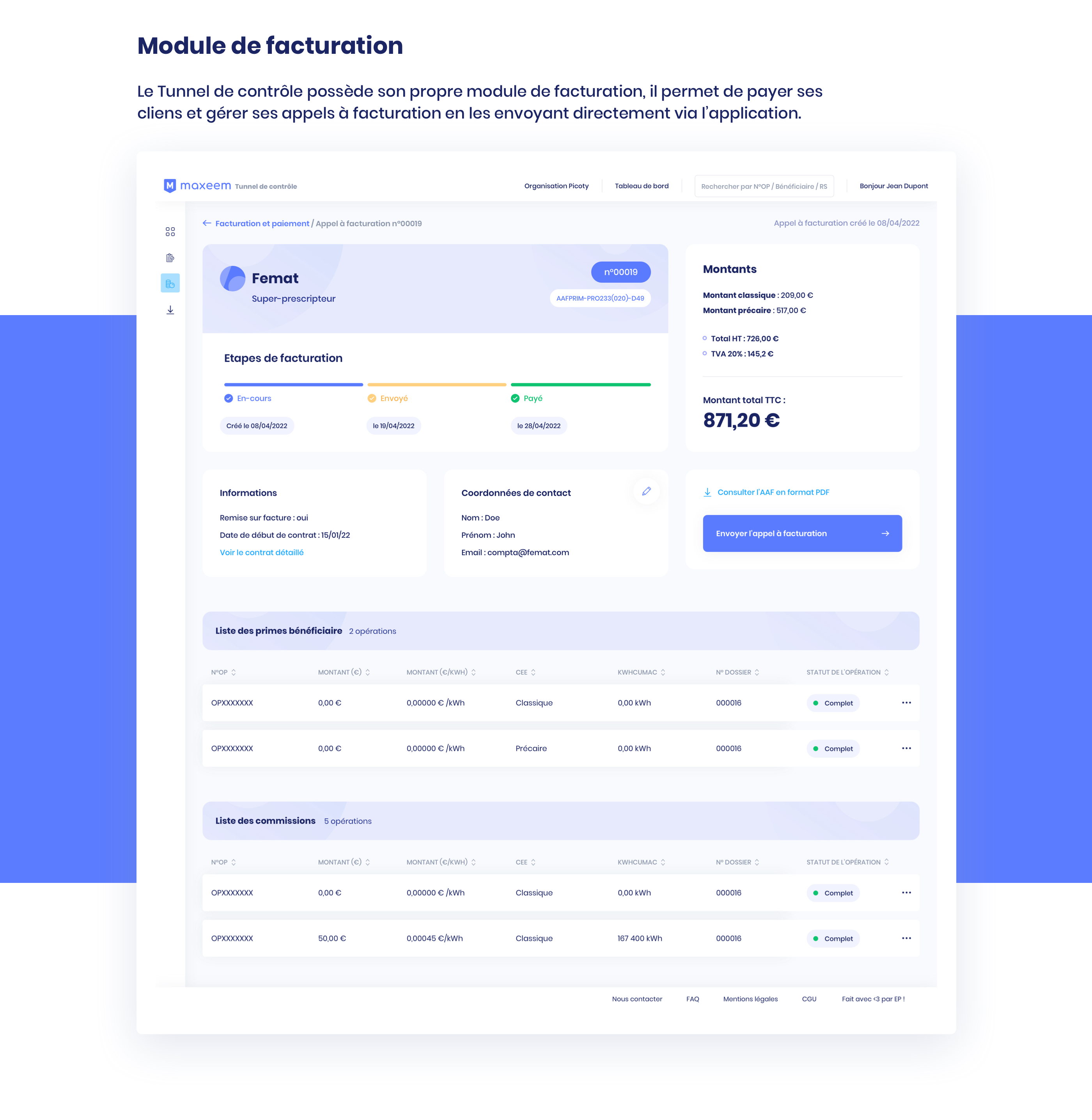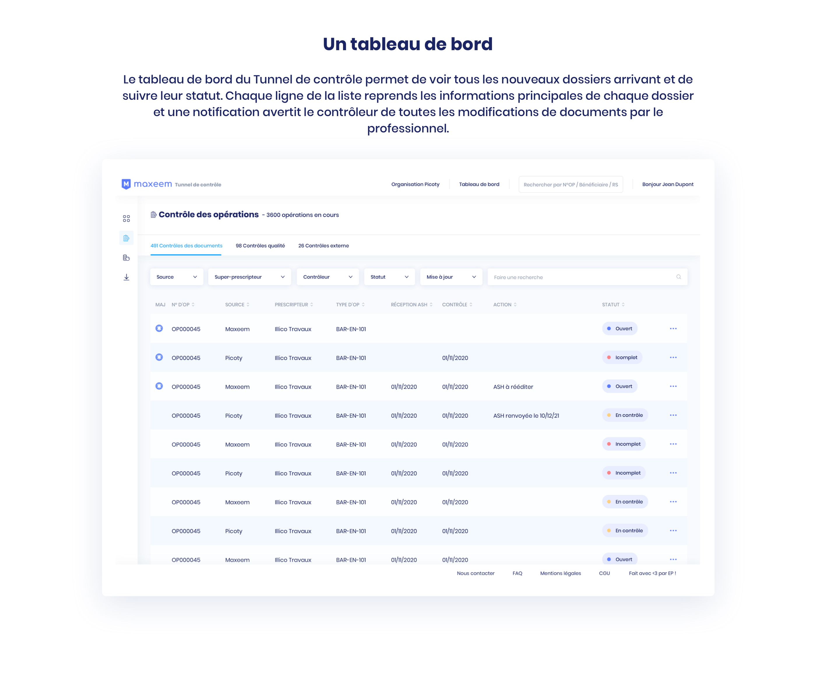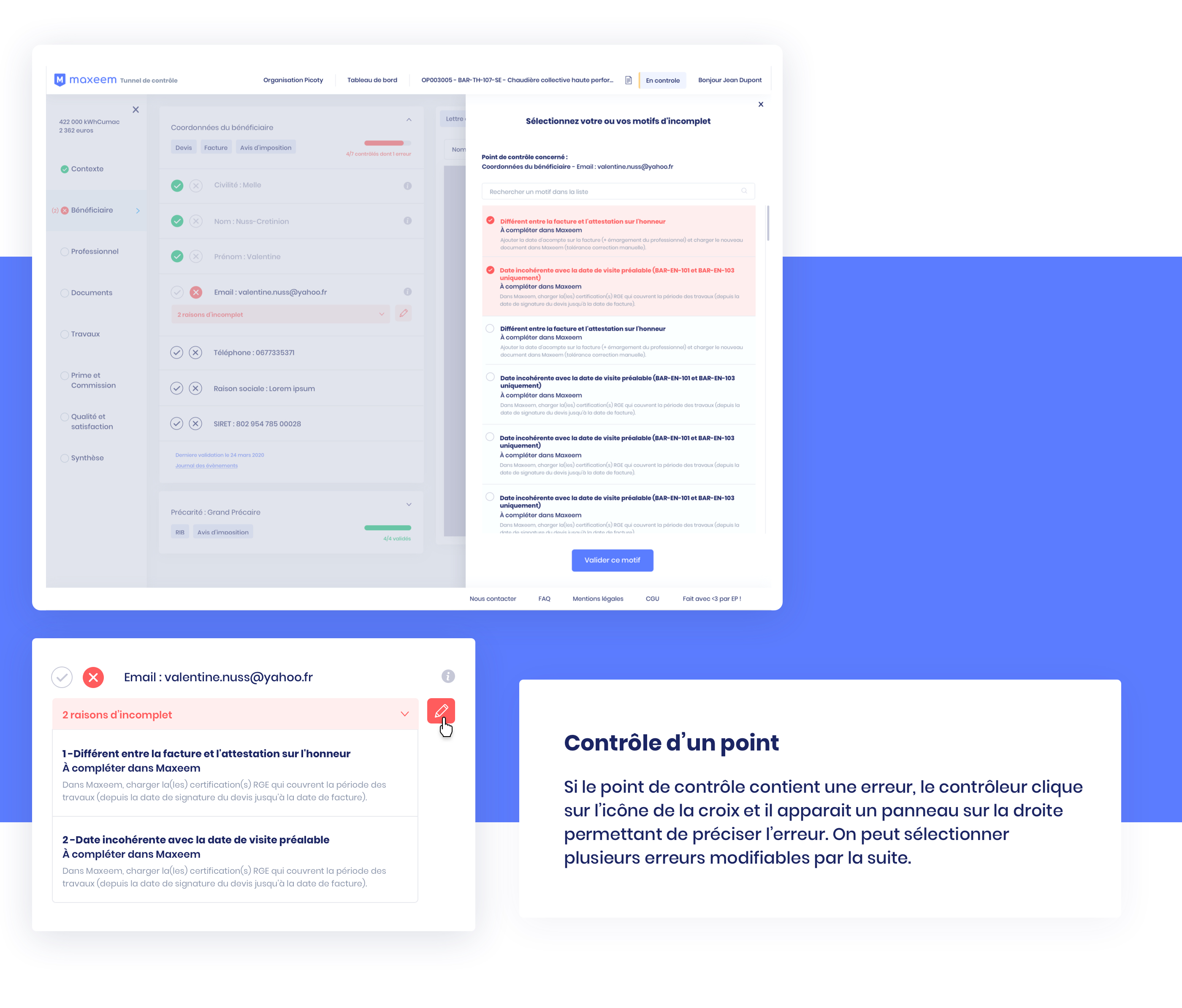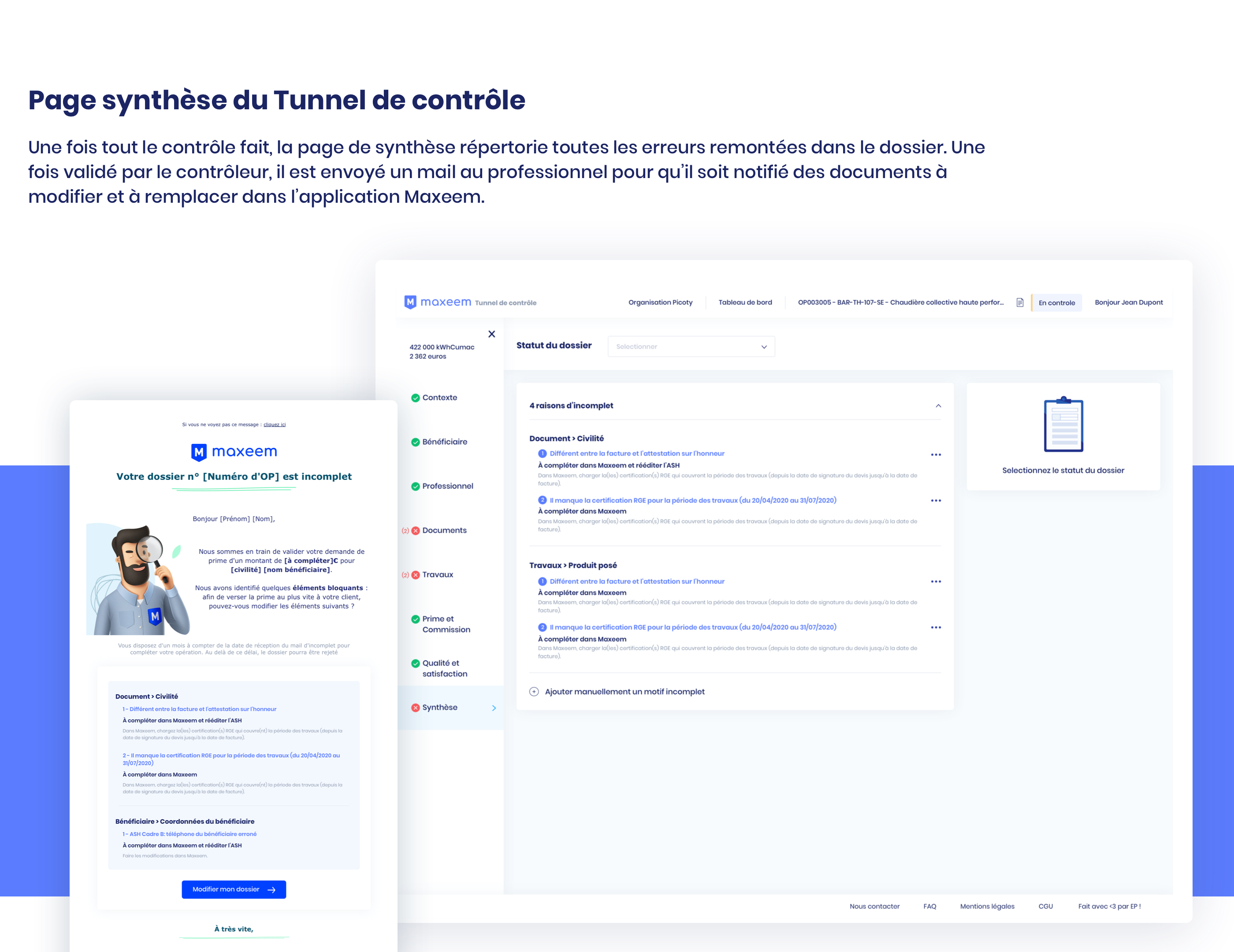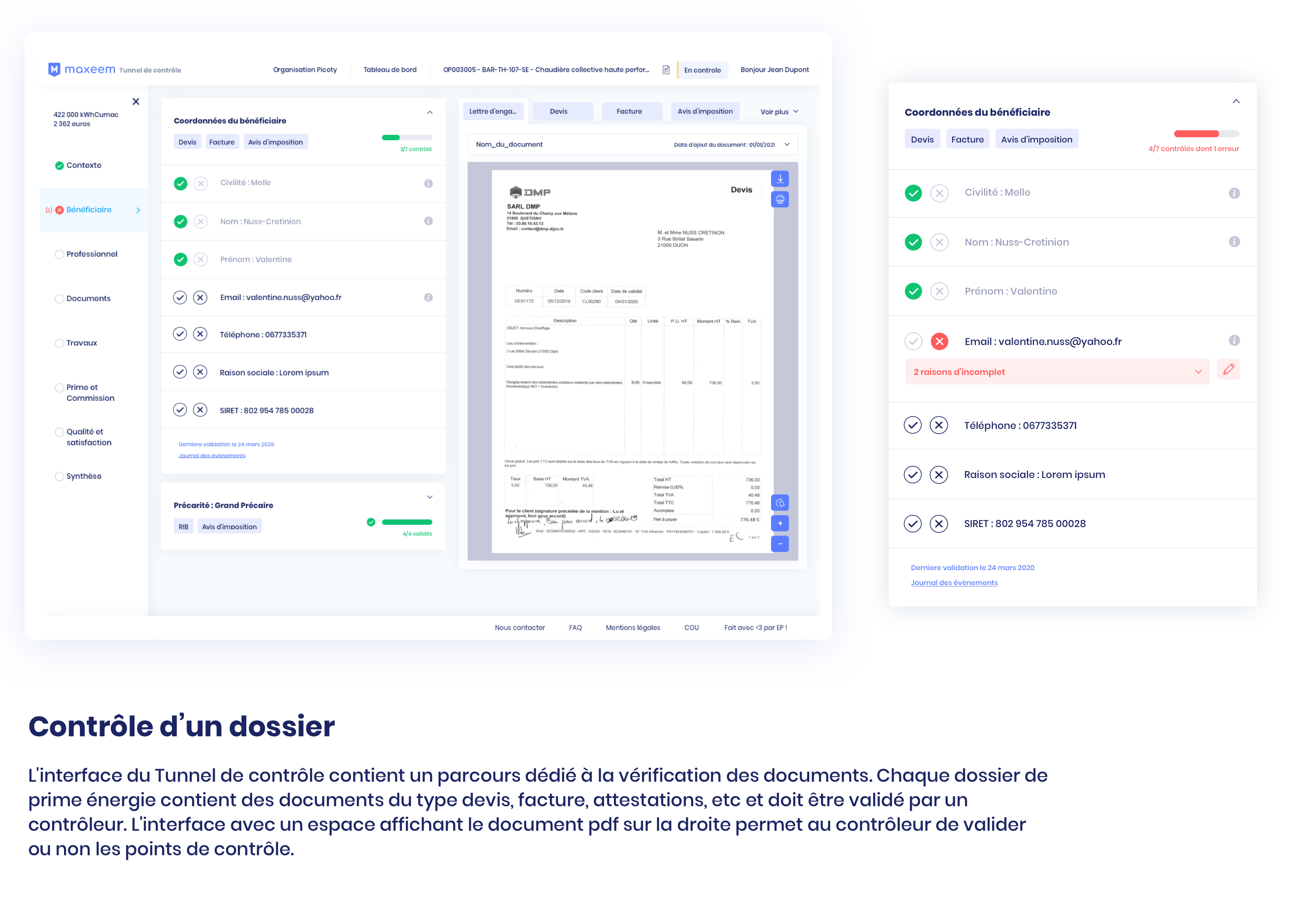 Le Tunnel de contrôle permet aux équipes de contrôleur Maxeem de vérifier les documents fournis par les artisans dans le cadre des dossiers de primes CEE. En effet, afin de déclarer une prime CEE, il y a un grand nombre de documents et d'informations à fournir à l'État pour justifier des travaux d'énergies réalisées. L'application du Tunnel de contrôle permet de vérifier les documents facilement, mais aussi de suivre le dossier dans le workflow de contrôle jusqu'à la facturation et le paiement du dossier.